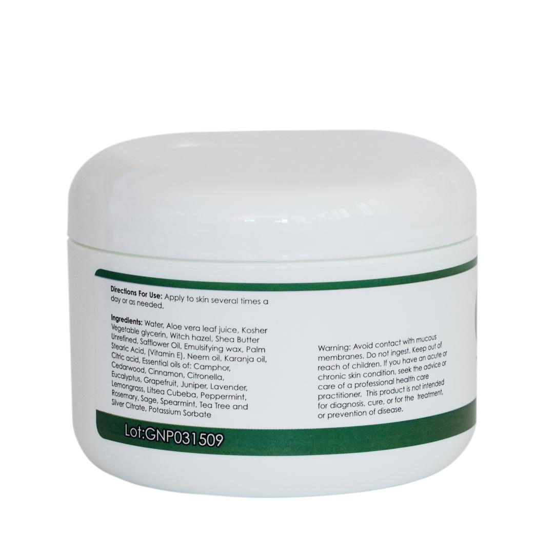 All Ingredients: Water, Glycerin, Aloe vera, Vegetable glycerin, Witch Hazel, Shea butter, Almond oil, Emulsifying wax, Palm Stearic acid, Vitamin E, Tinosan SDC, Cellulose, Potassium Sorbate, 100% Pure Oils: Organic Neem, Organic Karanja, Lavender, Peppermint, Lemongrass, Citronella, Tea Tree, Litsea Cubeba, Cedarwood, Cinnamon, Sage, Camphor, Rosemary, Eucalyptus, Grapefruit, Juniper and Spearmint.